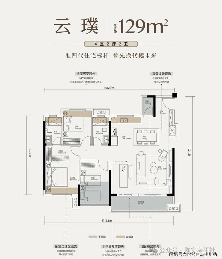 建面约129平 四房两厅两卫:边户,南北通透,四开间朝南,三面采光,优化空间较多,户型方正且动静分区,主卧独立卫浴和衣帽间,户型设计不错。