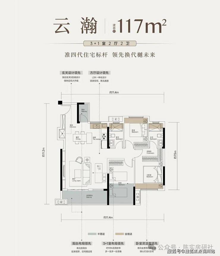 建面约117平 3+1房两厅两卫:2号楼边户,南北通透,3.5开间朝南,比较方正。