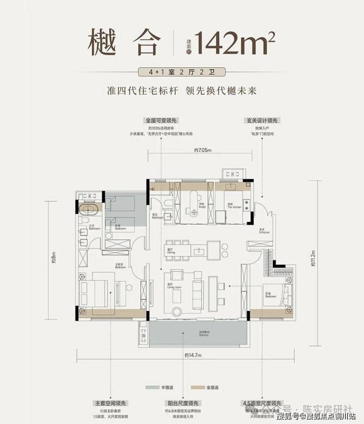 建面约143平 4+1房两厅两卫:小高层户型,南北通透,四开间朝南,户型设计很赞,南向阳台很大,还做了横厅,可以做成五房。