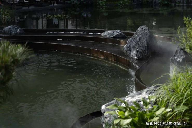 抵达“一池三山”,只见太液池底芙蓉花开,在氤氲水雾中摇曳生姿,池畔的点缀是来自江西宜春的88颗黑山石置石,三层跌水使空间层次更加丰富,鱼游浅底,激起阵阵涟漪,整幅画面更加悠然灵动。