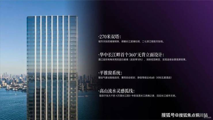 以360°纯粹环幕落地玻璃幕墙体系,搭配横向金属铝板线条造型以天空为幕,塑造长江自然起伏的流动天际线,赋予建筑丰富的动感与生命力。