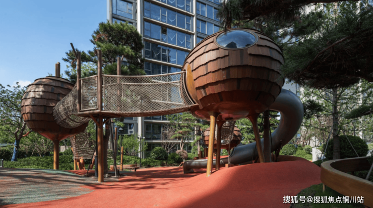 项目根据地形特征定制高低错落的原生态探索乐园,这里有各种创新趣味元素设计,树屋、木桩、滑梯、爬网。