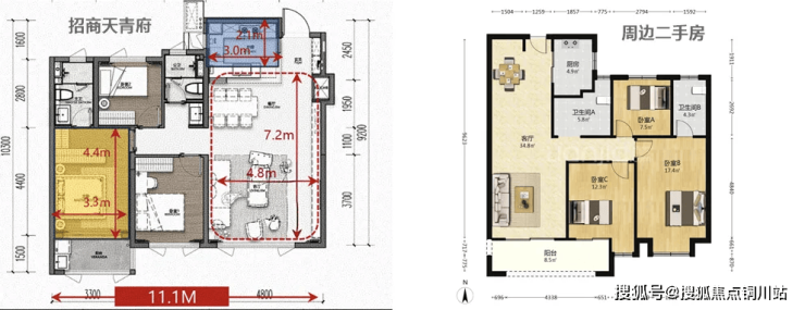 为避免拉踩嫌疑,我们就拿小区起步产品建面约107㎡产品与周边建面约117㎡的二手次新户型对比: