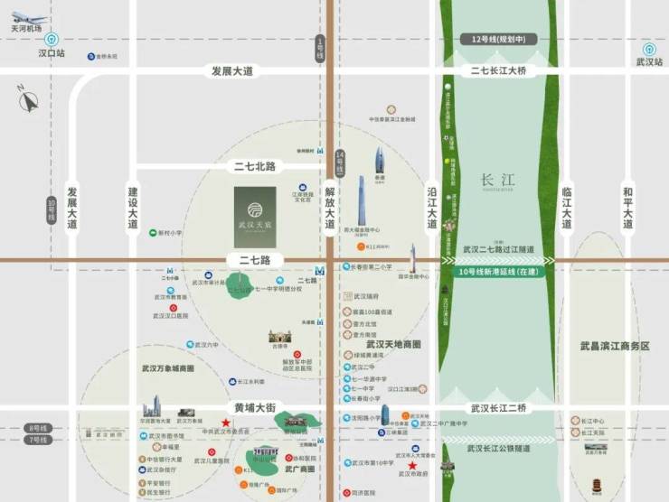 武汉天宸,雄踞二七滨江核心版图,先享城市崛起利好,同时依托二七滨江超级城市底盘,坐拥2KM超配生活圈。项目紧邻武汉“长安街”——解放大道,三轨环绕,拥享立体交通出行;周边荟萃武汉天地商业街、壹方南馆、壹方北馆等大型商业体。