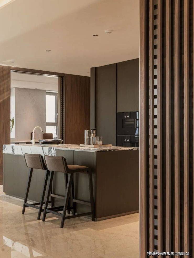 背景墙选用宝格丽花纹奢石,独特的纹理如同艺术品。餐厅岛台台面同样采用宝格丽奢石,与客厅背景墙相呼应,提升整体空间的连贯性与奢华感。