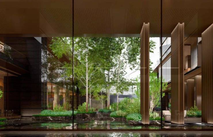 入户的位置天宝府采用了大量的金属格栅营造了一个城市屏风,通过中间宋风的“破瓣”把手把空间一分为二。既锁住了城市的喧嚣,又锁住了园区的淡雅。