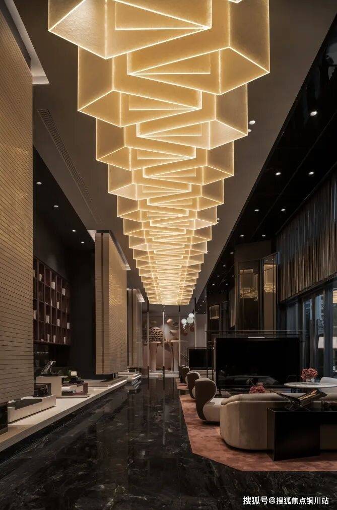 售楼部也是归家大堂,吊顶的灯阵,由近即远一字排开,空间穿透性,一目了然。