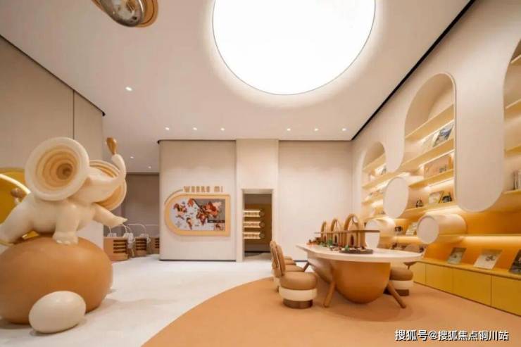 往大堂内部走,有水吧、阅读、会客等功能区,特别是童玩区,游玩设施,绝对不是拼多多淘来的便宜货,颜色活泼靓丽,现场富有童趣。