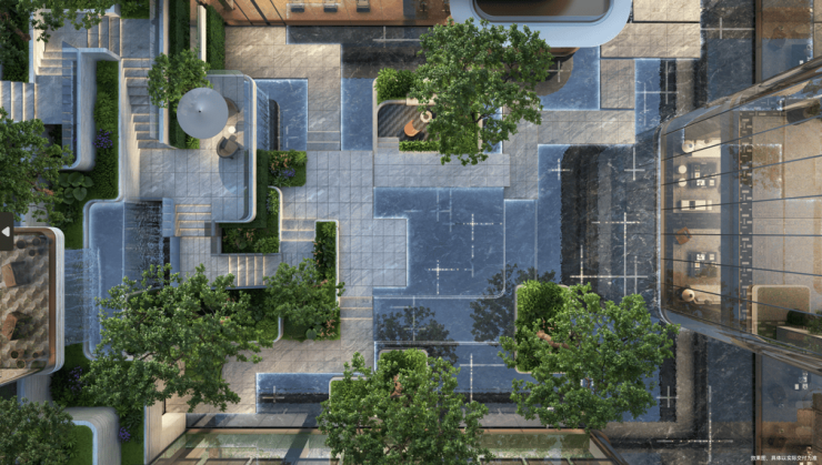 底层以蓝翡翠水景与下沉庭院构筑宁静休憩之所;中层多级挑台曲折上升,瀑布飞流直下,形成一道亮丽风景线;顶层平台设有女王花厅,为业主提供优雅的聚会空间。将度假酒店的隐奢美学融入社区,实现了美感和功能的完美融合。