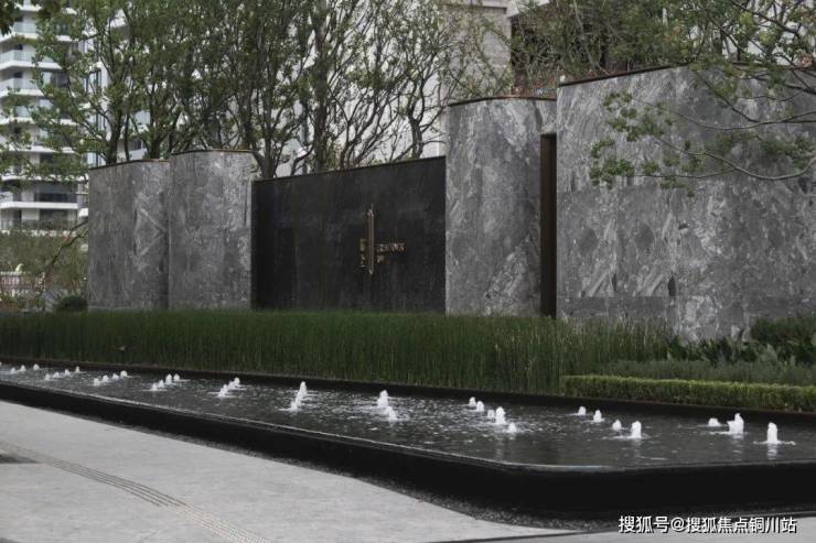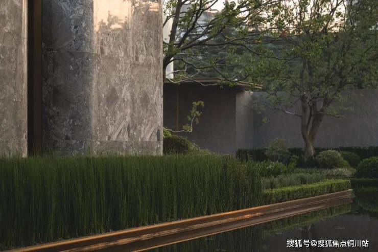 ▼错落有致的景墙组合与四面环绕的涌泉跌水形成了整个空间的城市玄关,直立成片生长的木贼与景墙互相映衬,相得益彰。