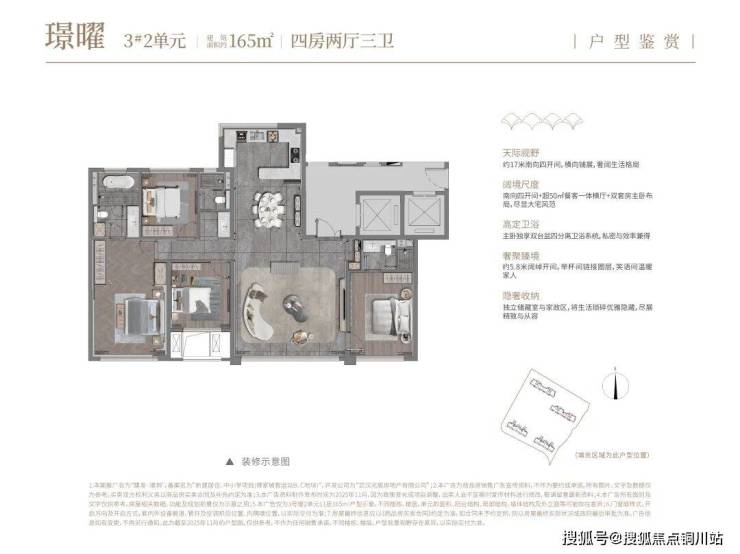 这套建面约165㎡四房两厅三卫产品,将空间尺度做到了极致: