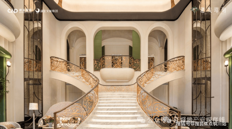 穿过大门就进入了挑高约10米的中庭,这里也是会所的接待大堂,借鉴了厦门千万级豪宅宸启瑞湖的海派美学基因。花瓣式艺术吊灯、南洋釉彩地砖、Art Deco珐琅彩玻璃、双向旋转楼梯......每一处细节,都是对卓越品位的精准表达。