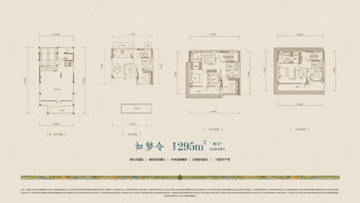 户型面积从275㎡到550㎡不等,首开地块主力户型有地上建面约295㎡南北入户和地上建面约340㎡南北入户的四个户型,户型设计超赞!