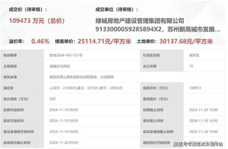 澜庭壹号院,即,苏地2024-WG-Z31号地块,位于高新区狮山商务创新区向阳路南、大运路西,是2024年绿城&苏高新以总价109473万元竞得,成交楼面价25115元/平,溢价率0.46%。