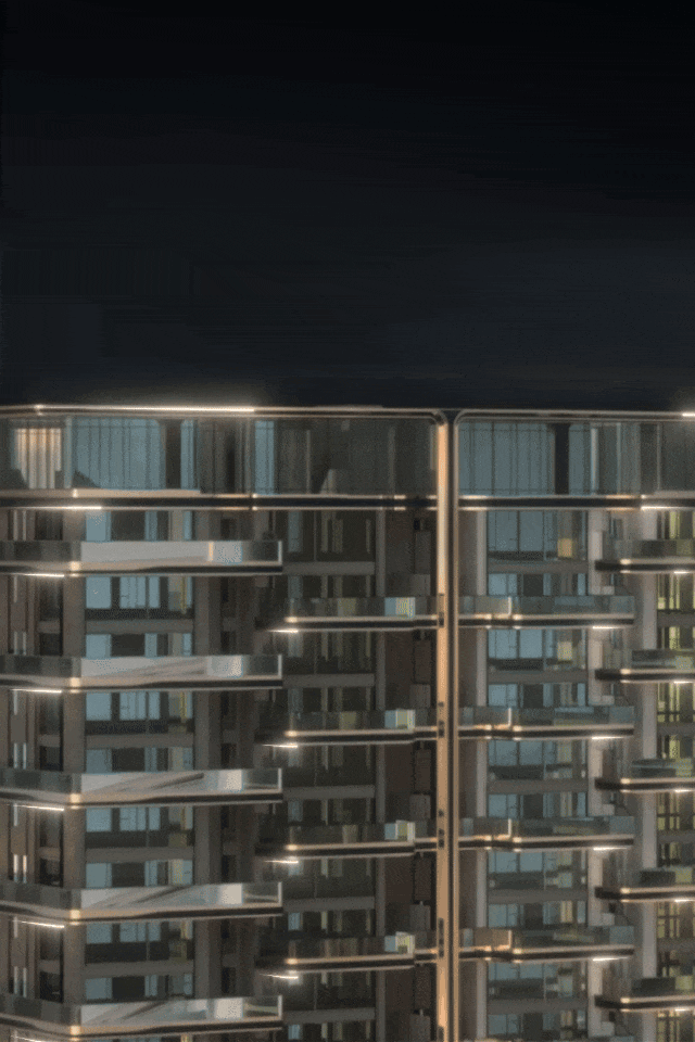 力生汉江序将现代科技与艺术结合,于屋檐顶部打造襄阳首个「星空冠」造型。金属质感铝板,结合高密度点状灯光,融合典雅与摩登,重构第四代豪宅的建筑表现。
