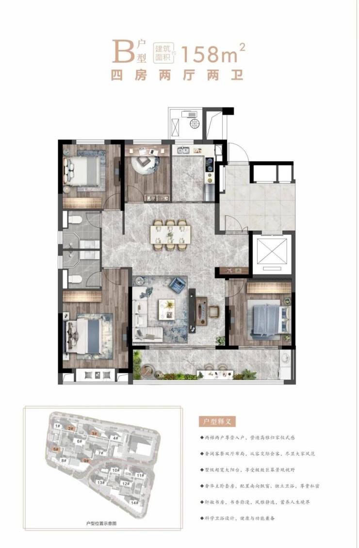 润和盛府是目前奉化主城区纯改善住宅先行者,项目总建筑面积约22万方,仅打造638席空中平墅,户型主力面积为158-228㎡,在建筑的尺度间,邂逅经验之外的惊艳。因此,当事业有成,生活进阶之时,一席低密度空中平墅,就是对自己和家人的最大犒赏,更是能够承载家族荣耀的传世奢宅!