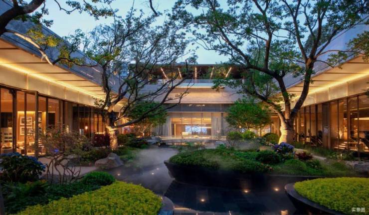 社区主入口柱子特选自巴西铂金钻奢石,呈现历久弥新的金属光泽,格栅照壁采用了4352块不锈钢拼接而成,青蓝色渐变彩釉陶板与青龙呼应。中庭水景历经219次石材切割、495道手工拉槽,构筑“天圆地方”水景庭院,居游之间营造度假式的园林生活。