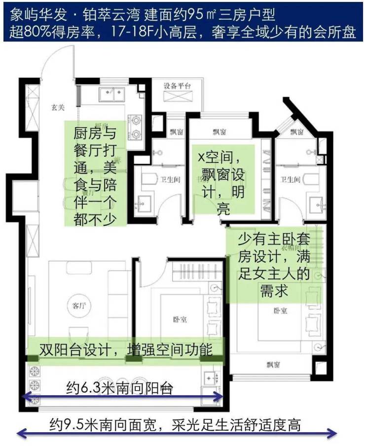 该户型紧凑实用,三开间朝南,明亮通透,约6.3m双联阳台,采光非常丰富。