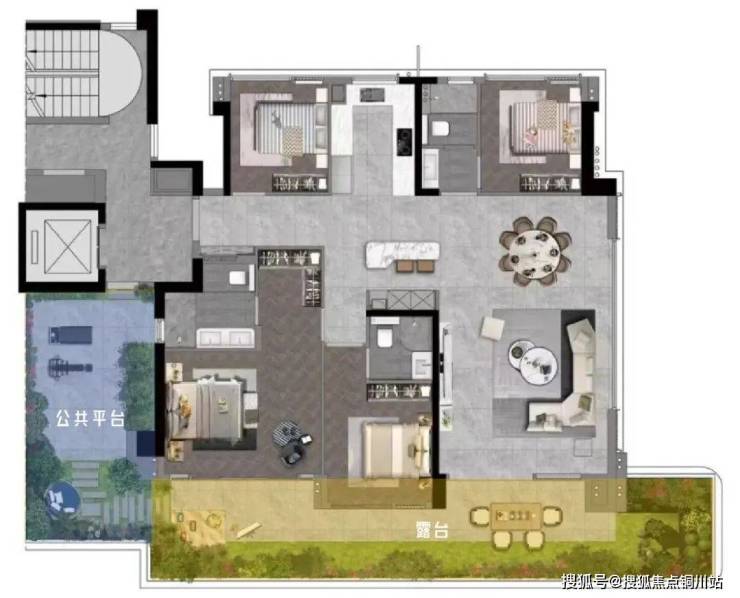 错层露台与公共绿化平台摒弃了「单独成块」的模块化独立布局,转而采用环绕式立体设计,通过阳台、落地窗等过渡空间与室内功能区形成有机衔接。这一调整使客厅、卧室等主要生活场景可直接与户外绿化形成视觉联动,最大化释放「住宅垂直绿化」的景观价值。