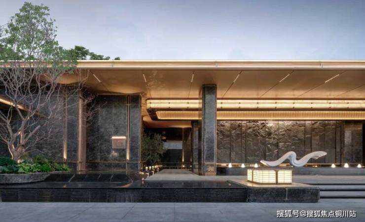 由青松指引,自景墙两侧进入内庭。景墙背后水幕潺潺而下,冲淡城市的喧嚣,沉淀出一方静候空间;经由艺术铜门进入园内,展现门庭礼仪。