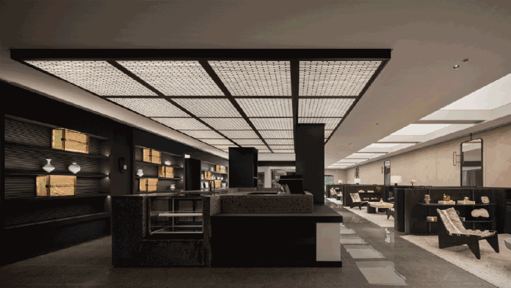 整个造型还运用了非遗竹刻元素,呈现出原有标签感的“画框感”外立面,让建筑整体显得挺拔、有层次。再叠加宽幅玻面+鎏金画框,摩登而通透。