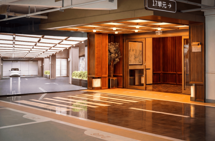 在美学之外,车库的实用价值亦以高标准打造。 车道采用金刚砂与固化剂工艺,成就坚实耐磨的基底; 车位铺设高品质环氧地坪,呈现一体无缝、温润易洁的质感。开阔的车位尺度,则可以轻松适配各类车型,让泊车成为一件舒心的日常小事,真正实现美学与实用的双向兼顾。