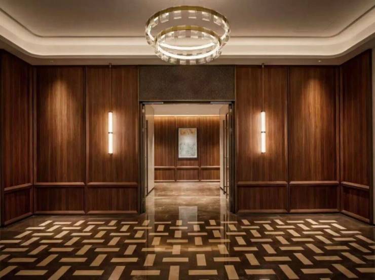 从光厅至入户,动线从容流畅,空间气度悄然转换。酒店式入户大堂将当代海派东方美学诠释得淋漓尽致, 艺术吊灯与温润木饰面巧妙相融,对称花艺与几何拼花地面彼此呼应,东方礼序与当代质感自然交融,勾勒出雅致的空间气度。