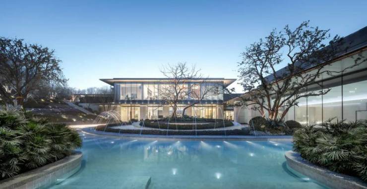 会客厅上下两层打通,内外对景,满屏的格调、奢华。并使用「超白spg无框玻璃」,造价虽高但胜在采光优越、视野通透。