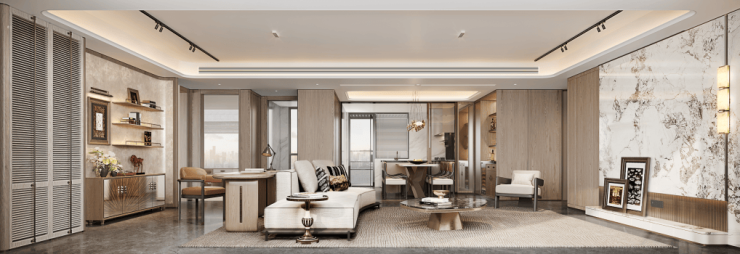 客厅:开放式的空间是全家的核心共享空间,巧妙融合了客厅、书房、餐厅与厨房区域,营造出通透而流畅的空间体验。温暖雅致的米色与木质棕构成主色调,与白色大理石纹理墙面相得益彰,既满足了现代生活方式,又通过精美的材质碰撞增添美学层次感。