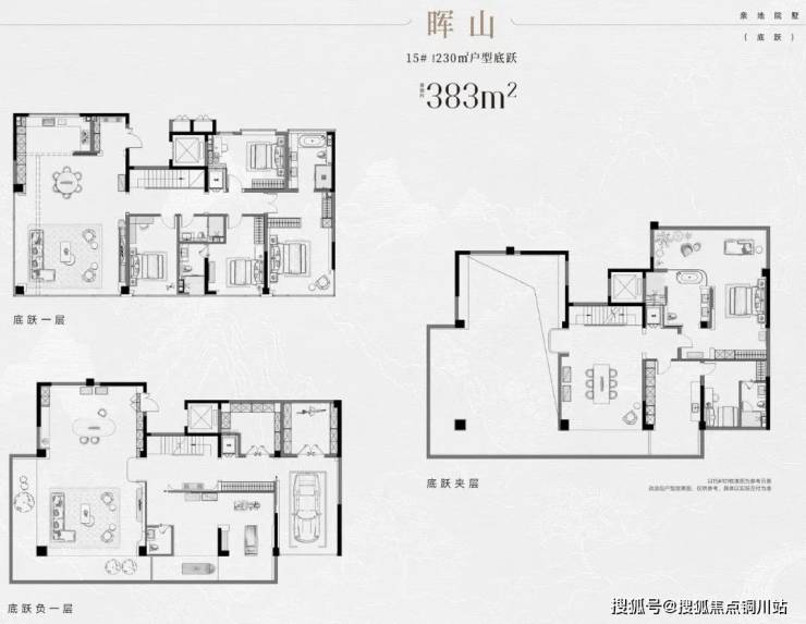 底跃—【私享院墅】户型建面约293㎡、313㎡、383㎡,南北采光最大约270°,地下室大面积光厅,因为地下室计入面积,拉低了单价,大概在4万小几。