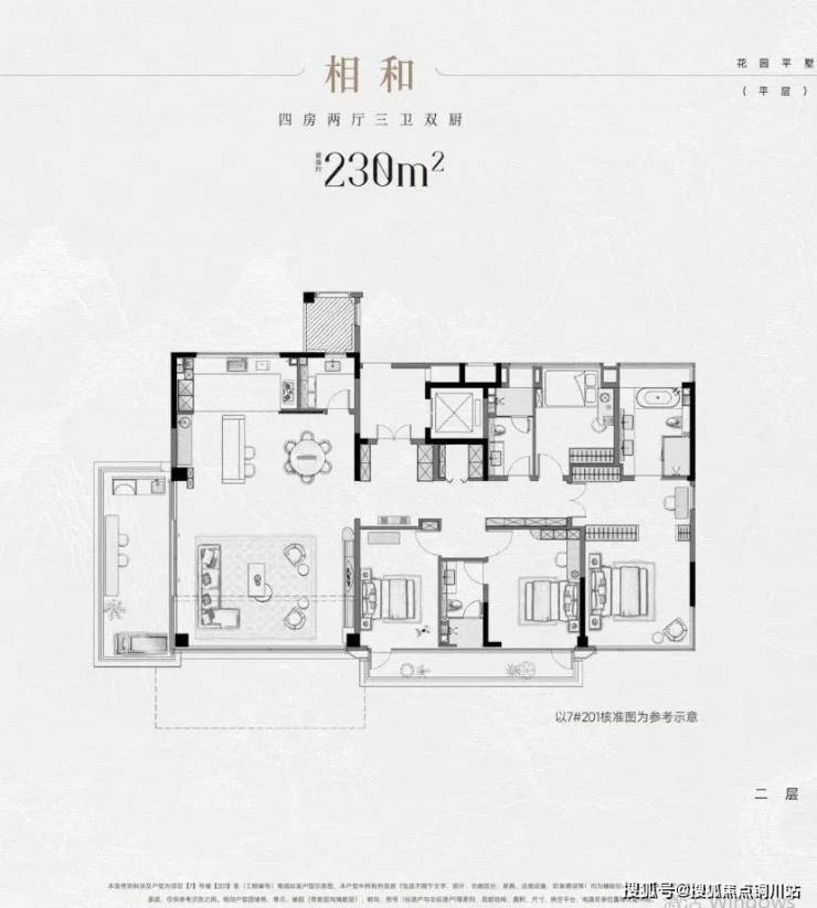 230平四房两厅三卫双厨,南次卧带露台外,客厅西边还有一个大露台,加之大横厅和圆桌,奢享级更上一层。