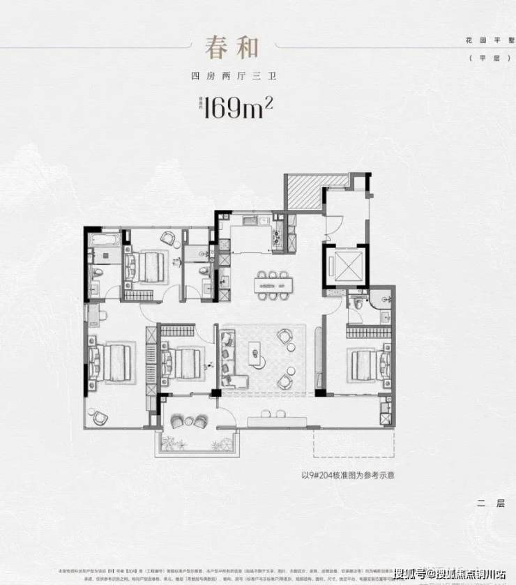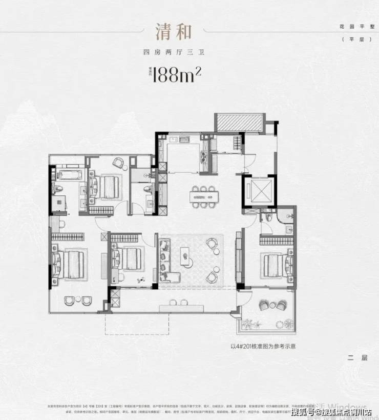 188平四房两厅三卫,更像是169平plus版,露台位置连通另一个南次卧,南主卧卫生间做了双台盆,舒适度更高。