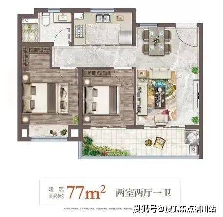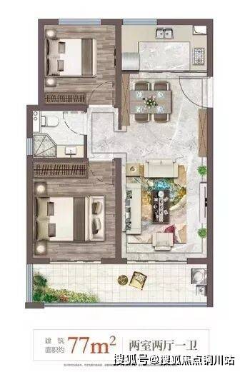 以上两个户型,都为77㎡两室两厅一卫的小户型。第一个户型,三开间朝南,整体采光较好;餐客厅一体,空间利用率大;主卧带衣帽间,卫生间干湿分离。第二个户型,两个卧室南北朝向,餐客厅和南阳台相通,通风较好。