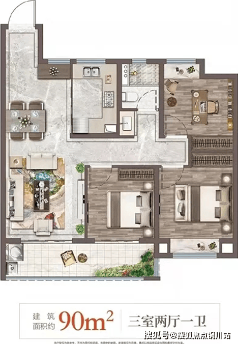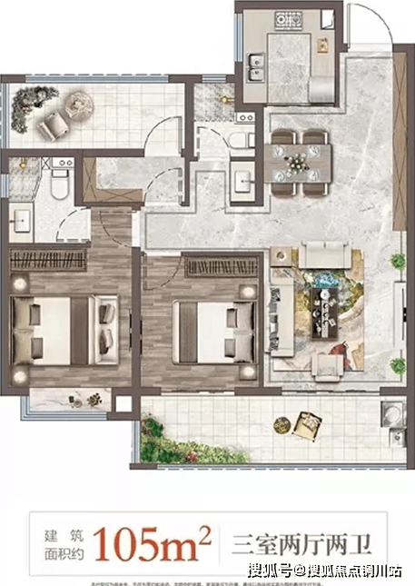 以上两个户型均为三室的设计,都设有两个房间和一个书房,功能性更全,两个卧室都朝南;相比来看,105㎡的户型面积更大,拥有南北双阳台,能更好的满足晾晒和休闲需求;两卫设计适合也更适合有老人或者有小孩的家庭。