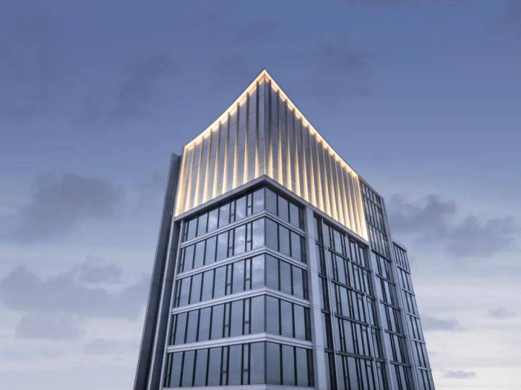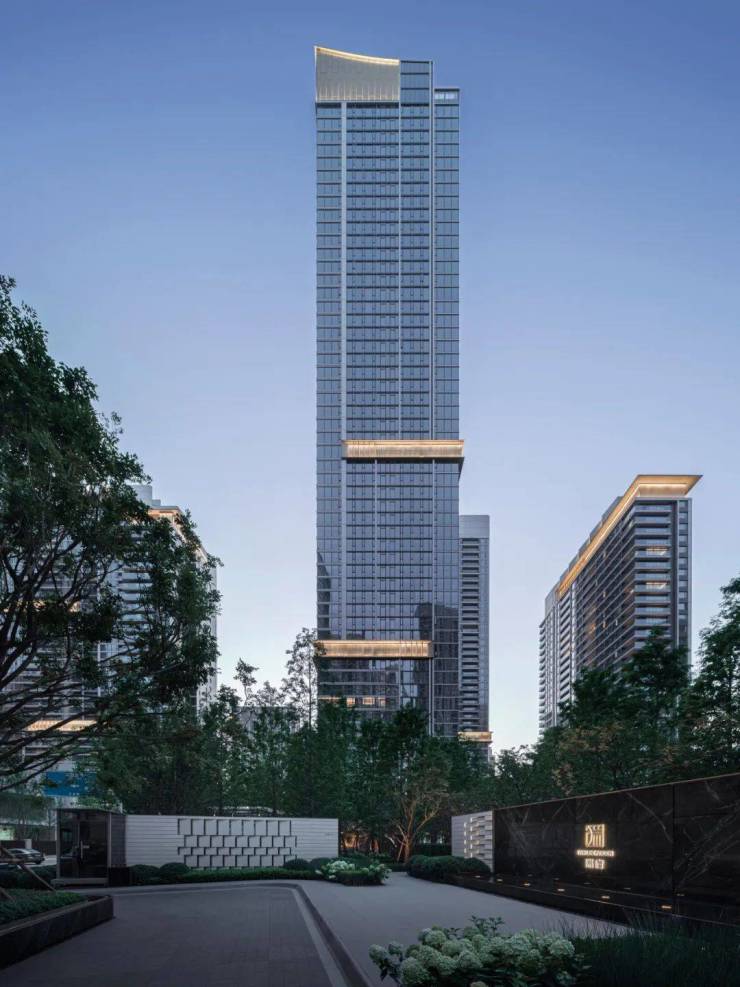 外立面运用国际视野和审美,设置竖向型材线条加强挺拔感,展现长江波光浩荡质感,以大江大河气韵,致敬土地文化。搭配“风帆”塔冠造型,融合鎏金腰线瑞字纹穿孔铝板,成为瑞府藏家身份的专属昭彰。