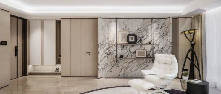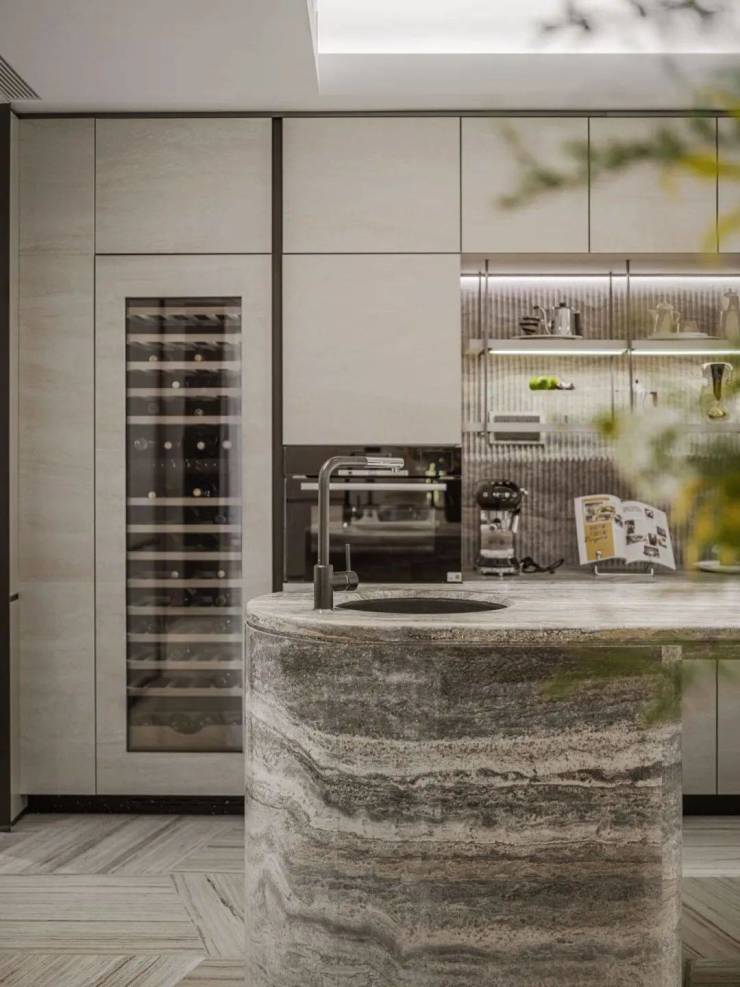 履迹全球,千臻万选,大量运用云中翡翠、云水谣的奢石,开创性使用罗马拿铁洞石岛台、整面白沙石沙发背景墙、高定岩板西厨柜、枫影木等稀贵建材,重塑生活的舒适与优雅。