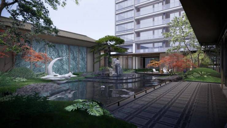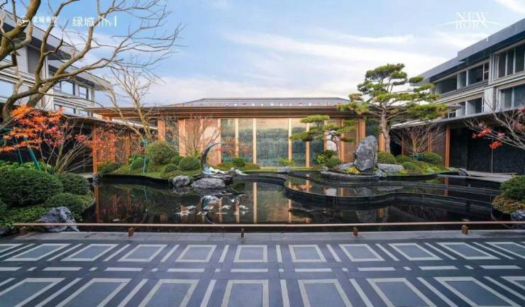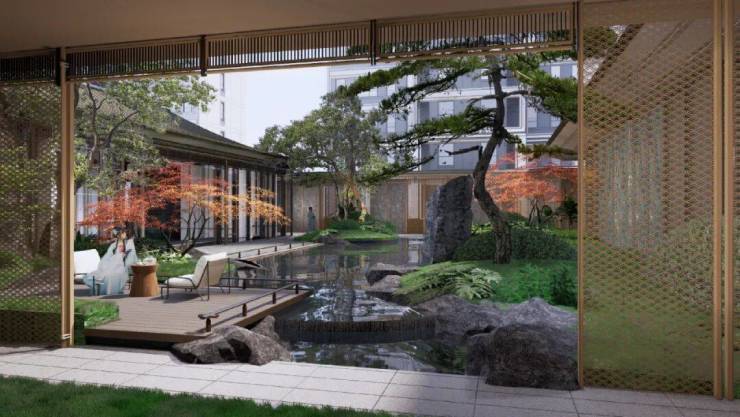 二进月影揽翠,以宋式园林为蓝本,奢贵树种、艺术叠石、造型雕塑漂浮于镜面水景之上,交相辉映、俯仰相合。
