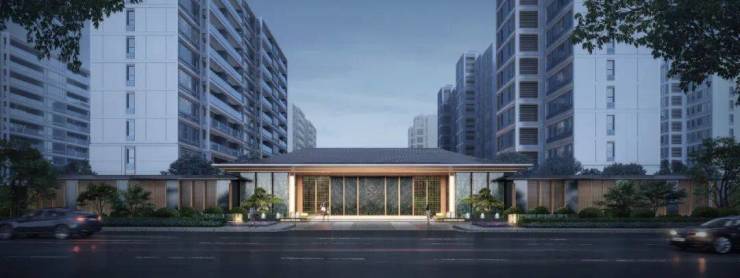 一进月映绮门,在建筑形式上注重空间排场以及形制美感,约70米的恢弘尺度、中轴对称式布局,构建出高墙大院的奢宅气质和极具气势的社区形象。
