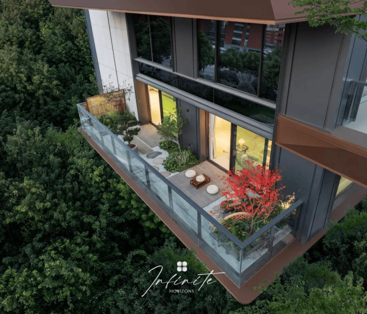 为形成垂直楼宇里的室内“小桃源”,中海·江南玖序还通过奇偶层平权化、采光私密平衡化、空中花园创新设计等方式,将地面的庭院“搬”到空中。