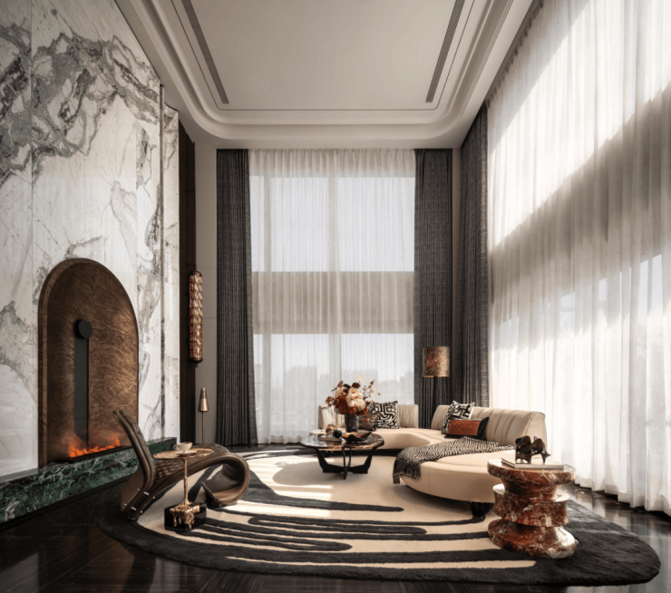 这样的设置在其他项目前所未见,也是中海在南京首次出现的产品类型。其约6.6米墅厅层高,形成“立体化”观景视窗,以向上一倍的高度营造视觉与感观的延伸;加上墅厅最大达到约12米的面宽,消融室内外界限感,舒适度极佳。