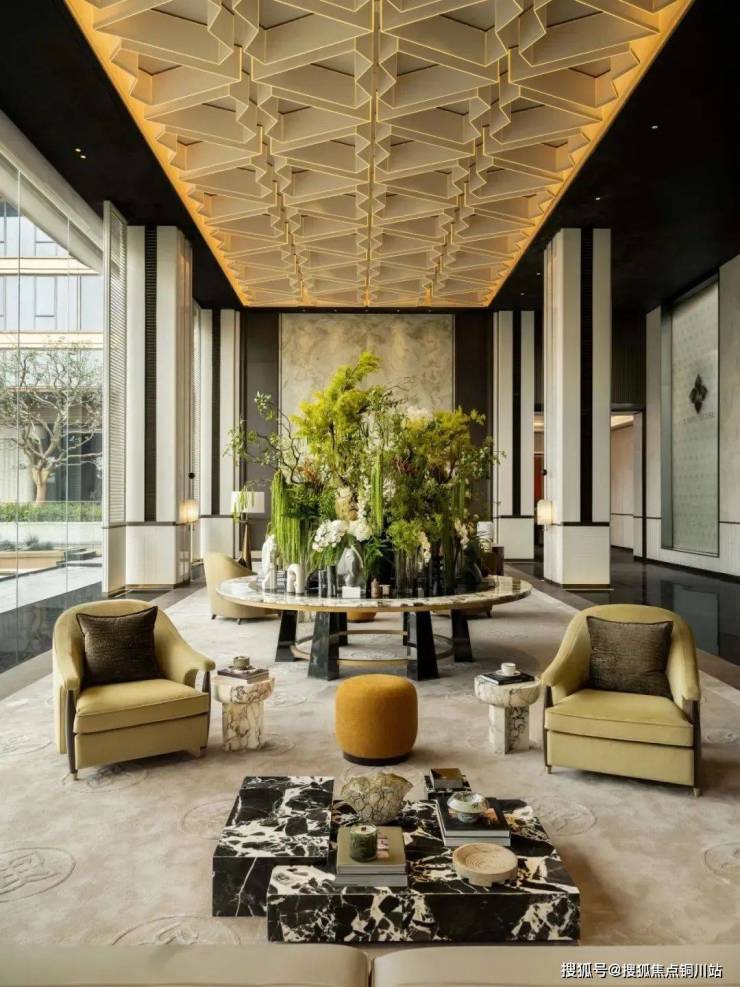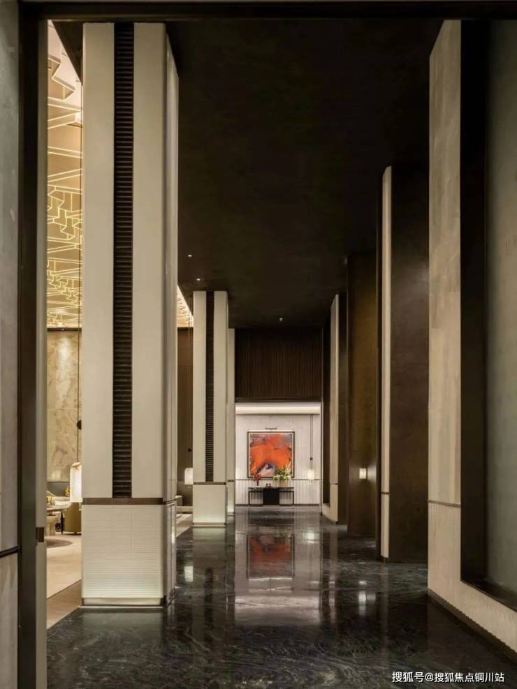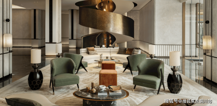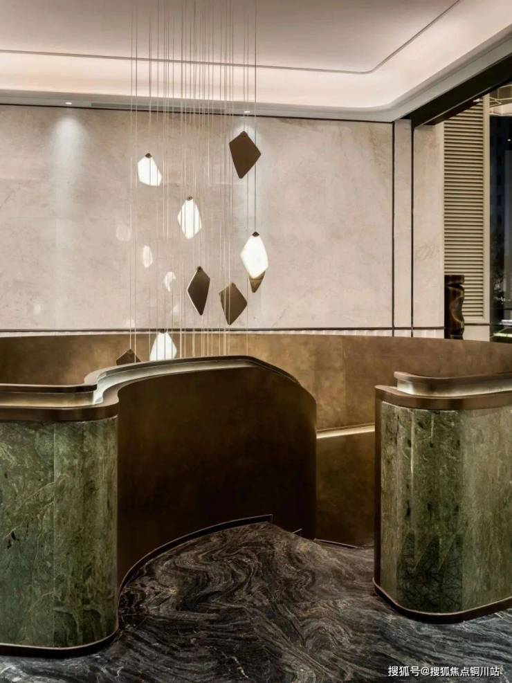 步入接待大厅,视线即刻被金属与光影交织的景象所吸引,大厅吊灯宛如悬浮的金色梦境,每一道光线穿过精雕细琢的凹槽,在空间织就流动的光晕。