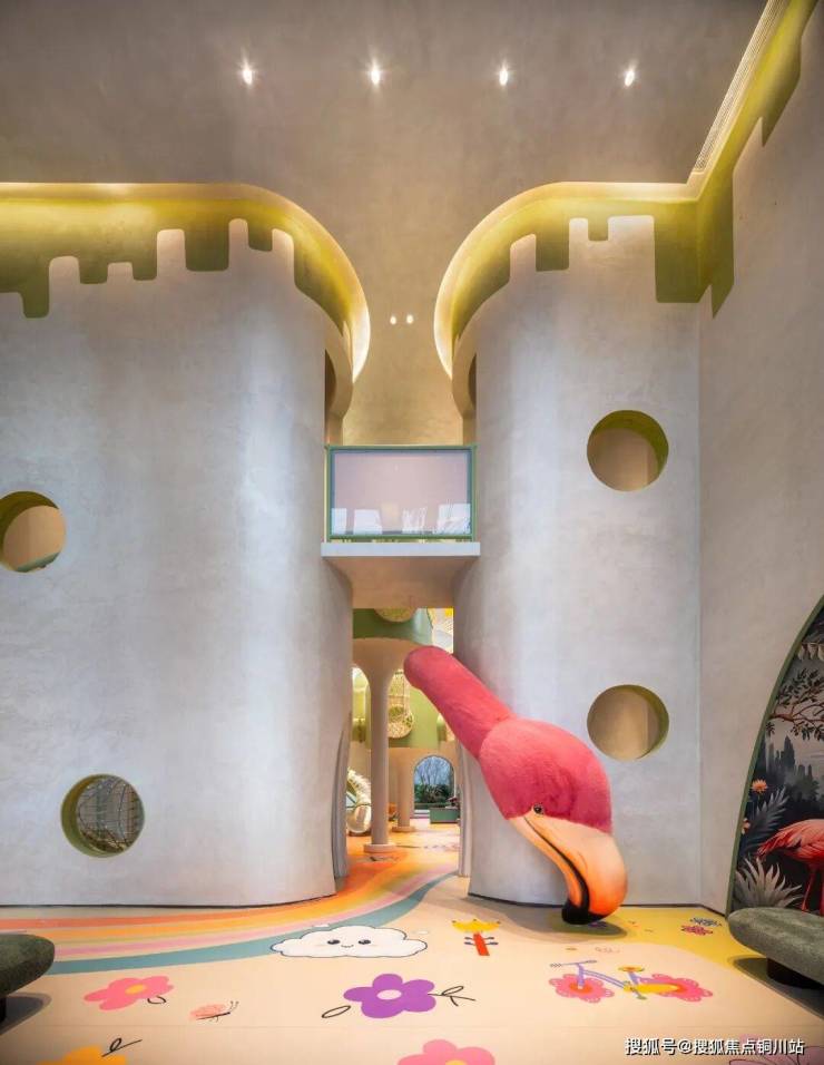 绿城·知海棠后来怎么做?以童玩空间为例,表面上只是做个超大的童玩区,将整整一幢楼的架空层全部开辟出来,面积近500m²。站在庭院中央,抬眼即是高达近8米的全景舱树屋,有着绿野仙踪里翡翠城的样子。探头进去,几人高的丛林滑梯纵横交错,一只巨大的“火烈鸟”盘旋而下。
