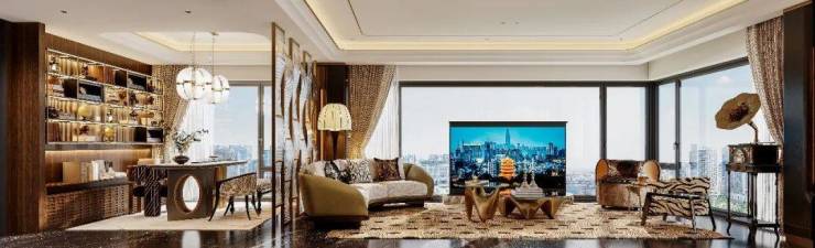 建面约158㎡户型的主卧套房实际空间约达33㎡,这个尺度能够实现当下五星级酒店套房最流行的洄游动线设计。