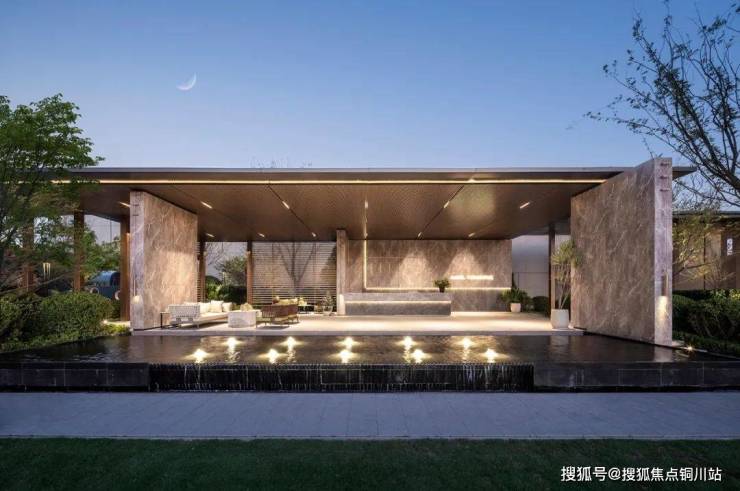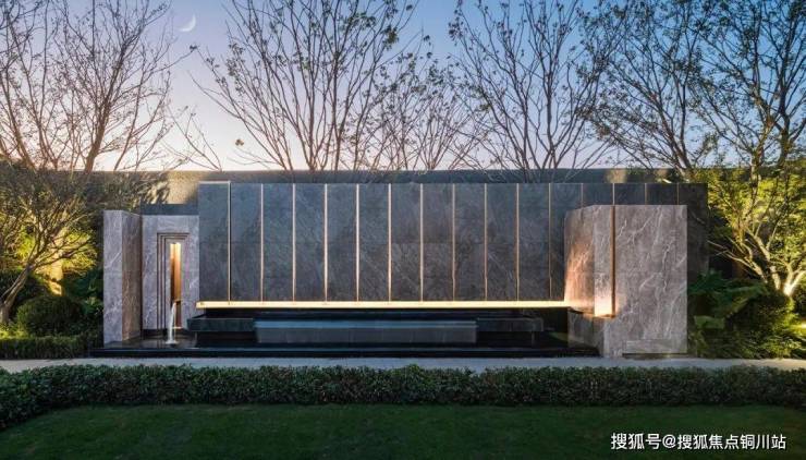 与阳光草坪相映成彰的,是精致雅奢的 水景墙-“凭栏听泉” ,远观可赏,近观可听,侧墙精致出水口的设计,古典气质与现代繁华相融合。运用花纹优美的石材打造的景墙,提升了景观的品质感。
