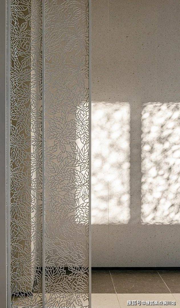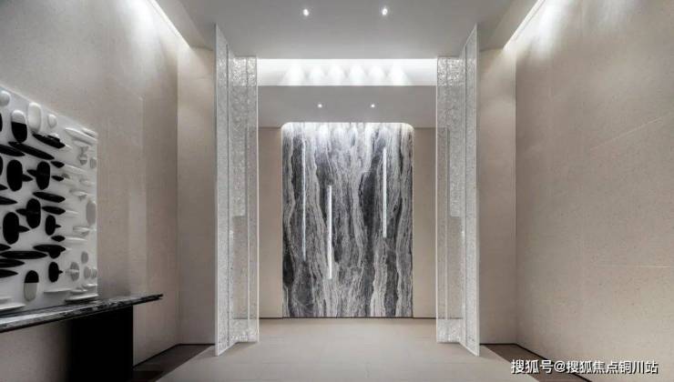 移 步入户大堂内,吸引眼球的通高梧桐隔断,由专业工匠手工耗时匠心打造,象征南京地脉美学的梧桐叶脉纹路,不仅带来诸事祥瑞的美好寓意,更呈现出与众不同的艺术风韵 。更搭配“千山暮雪”岩板背景墙、珍珠母贝门把手等,营造出颇具藏品感的场域氛围。归家即是故事,闲处便是光阴。