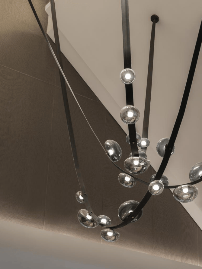 步入接待大厅,一缕光芒倾泻而下,靓丽的线条给大厅增添一抹趣意。光点打磨成线条,天花板处以敏捷走线,演绎人字形中国经典穹顶,削弱空间的边界感与分离感,立体的四维感让平和的元素奠定了温润基调。