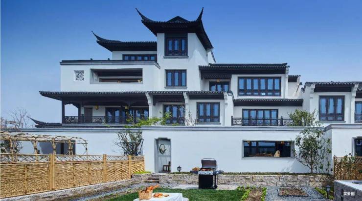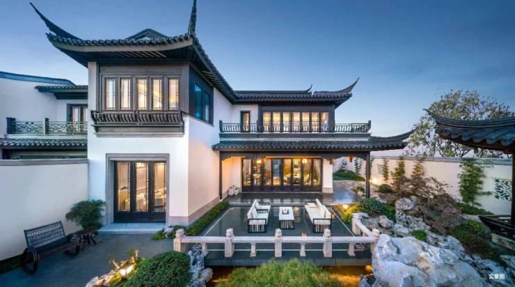 项目以江南建筑的“粉墙黛瓦、飞檐戗角、水榭廊檐”为基本元素,打造出中式宅院,“4-3-2”中式建筑结构产品,高低错落的外立面,中式粉墙黛瓦,沉浸于融入了吴越文化、江海文化、海派文化的苏式坊巷中。