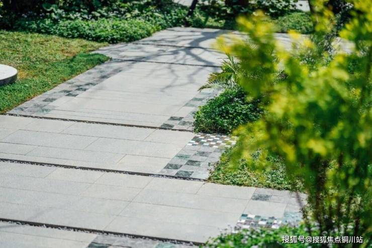 水磨石台面构建的花园小径,与整个绿地景观相生相融,圆润的线条与景观的此起彼伏相得益彰。