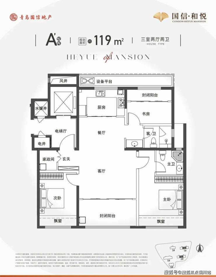 先看建面约119平的套三双卫户型。