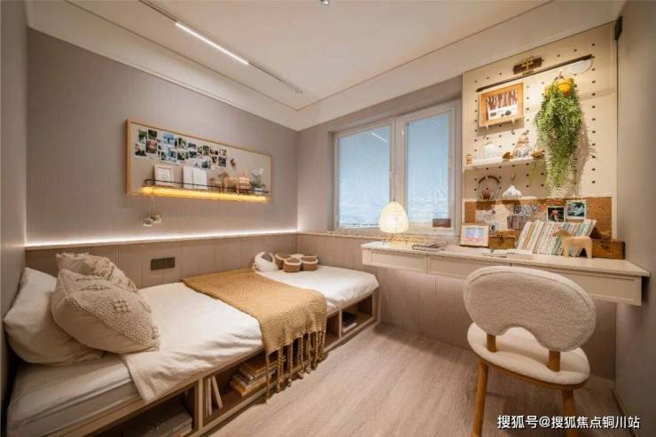 次卧实现多功能均衡,定位家庭加油站,可以作为阅读、办公以及收藏兴趣爱好的空间。